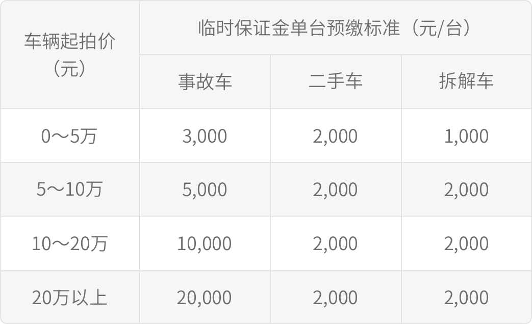(1)2000元可以参拍8台二手车,参拍事故车时需要单台缴纳临时保证金,仅需缴纳少量保证金即可畅拍多台车辆;